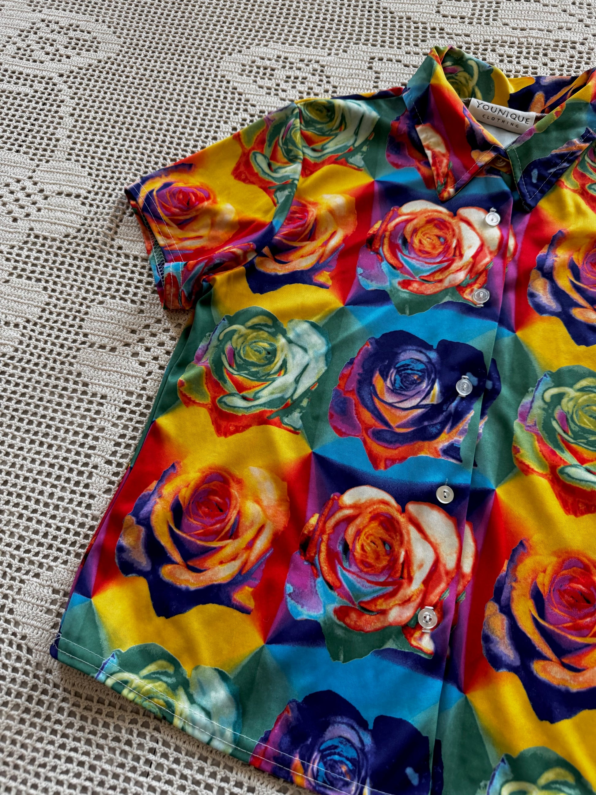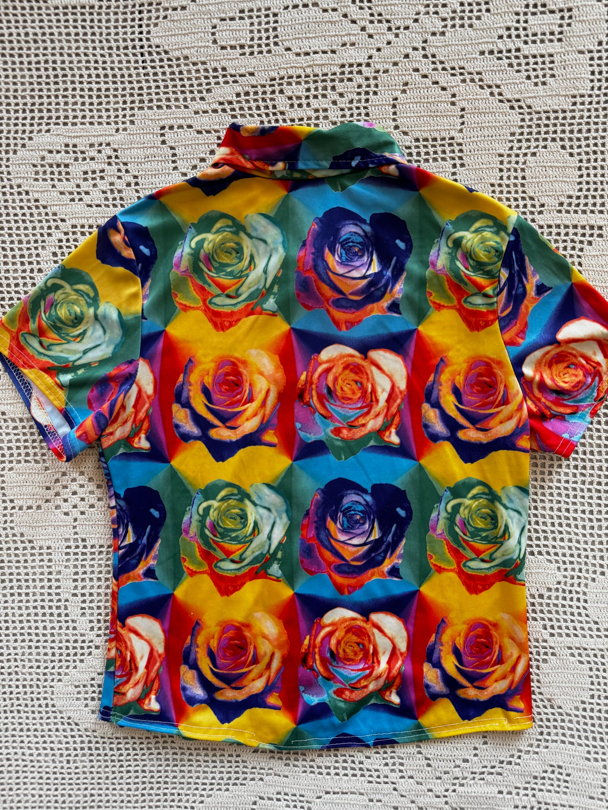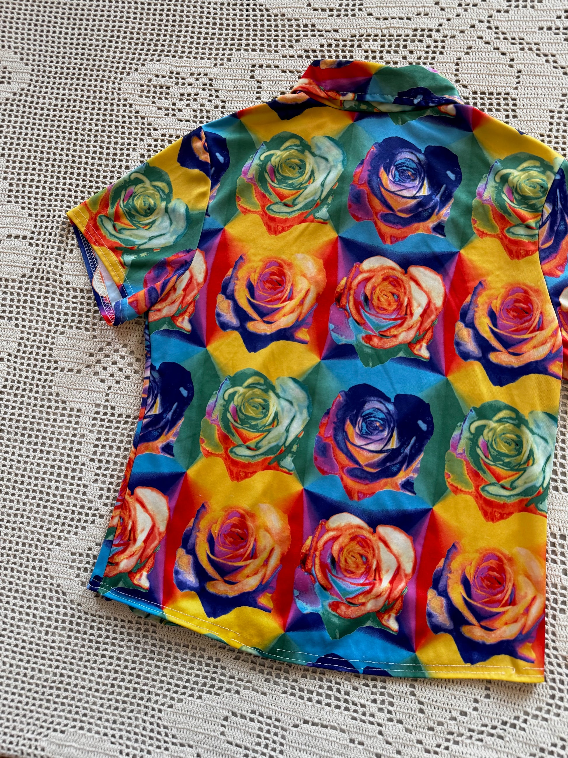 y2k Digital Art Rose Print Short Sleeve Button Down (M)